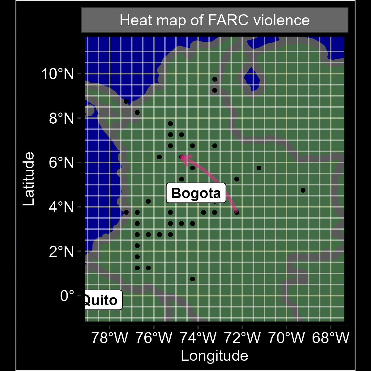 In research with Gary Uzonyi (UTN), I analyze how the strength and goals of rebel groups affect their targets and sequence of attacks. To study this process, I developed a novel spatiotemporal network measure. Figure 3 displays an example of the measure for the rebel group FARC in Colombia. For our first article using this approach, we analyze the interaction between rebel group strength, goal, and target of attack. Secessionist groups tend to carry out less clustered violence against civilian populations versus state forces compared to revolutionary groups. However, the effect is moderated by group strength, with weaker secessionist groups carrying out more clustered violence against civilian populations compared to stronger secessionist and revolutionary groups. In contrast, strength has a null effect on how revolutionary groups carry out their attacks against civilian populations and state forces.