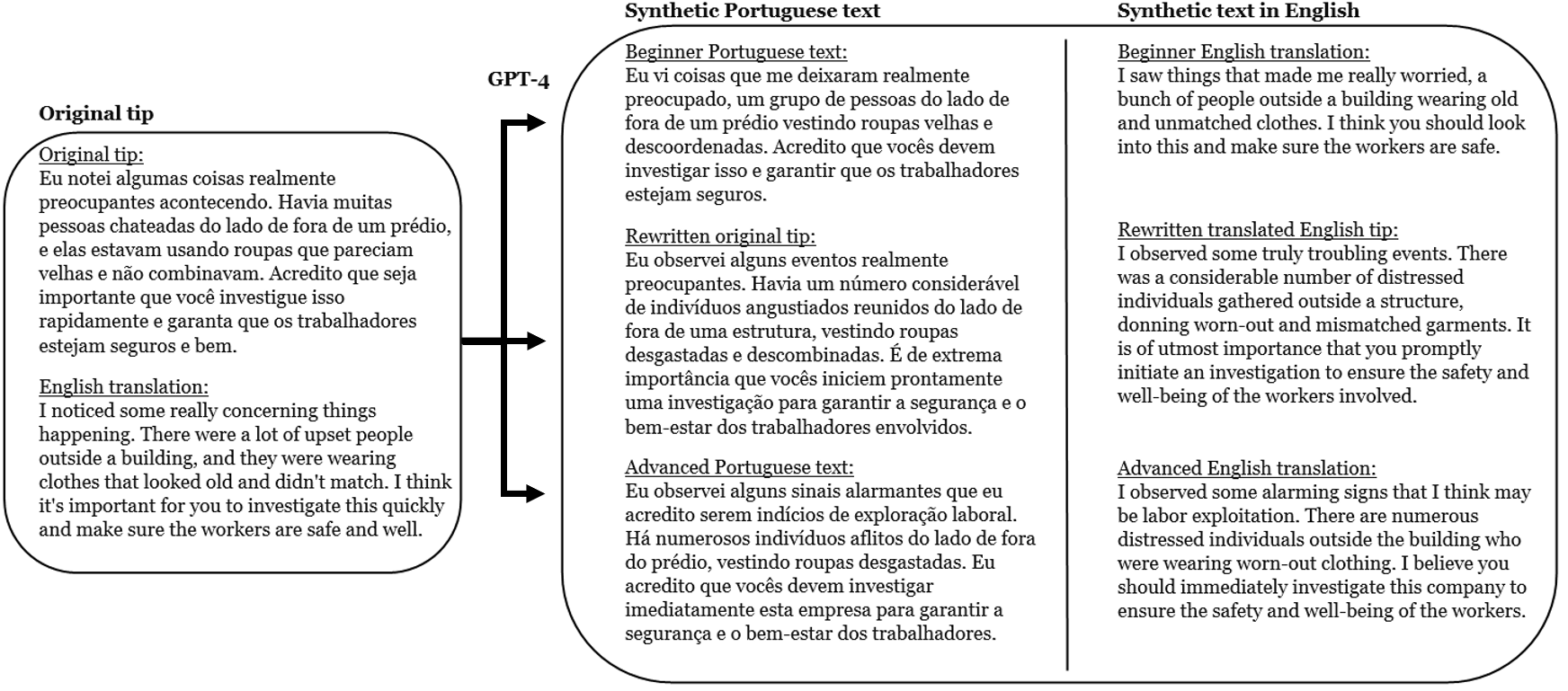In addition to this paper and project, we are setting up a project where we would use the tip data and LLMs to assess biases in policing responses. To do so, we plan to generate synthetic text using GPT-4 at different literacy levels. With the synthetic text, we assess whether victim tips with “lower literacy levels” receive slower predicted response times. Figure 3 displays an example of the synthetic text generation in Portuguese and English. In the left column, we see an example of a potential tip to law enforcement about labor violations. The right column displays the synthetic text based on tip data at different literacy levels. To complement this analysis, we are developing an experimental design in which respondents will rank the priority of a victim tip where we exogenize the literacy level of the data. Together, these approaches will help us understand how a victim's education and class levels relate to variation in police responsiveness.